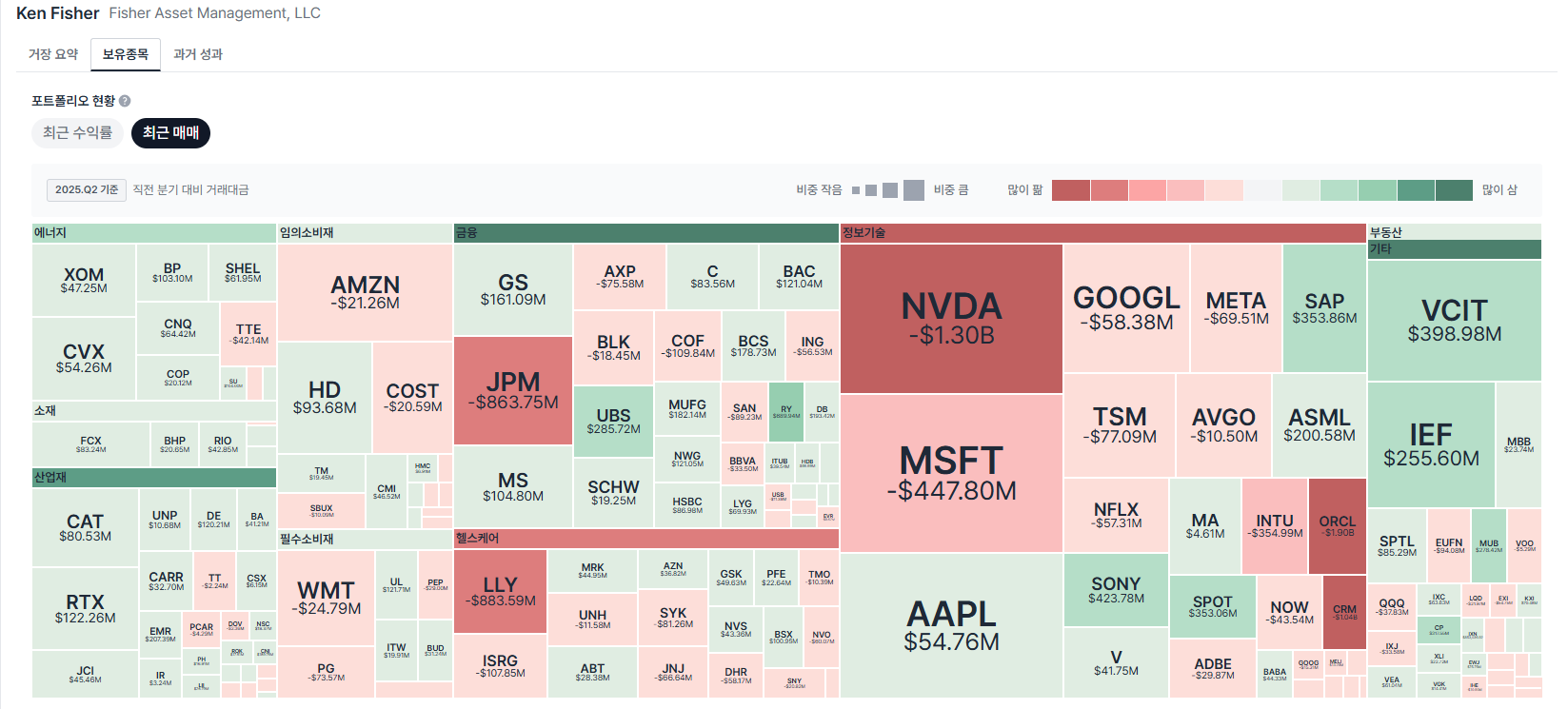 - NVDA (-$1.30B), MSFT (-$447.8M), JPM (-$863.75M), LLY (-$883.59M) → 기존 대형주 일부 차익 실현.