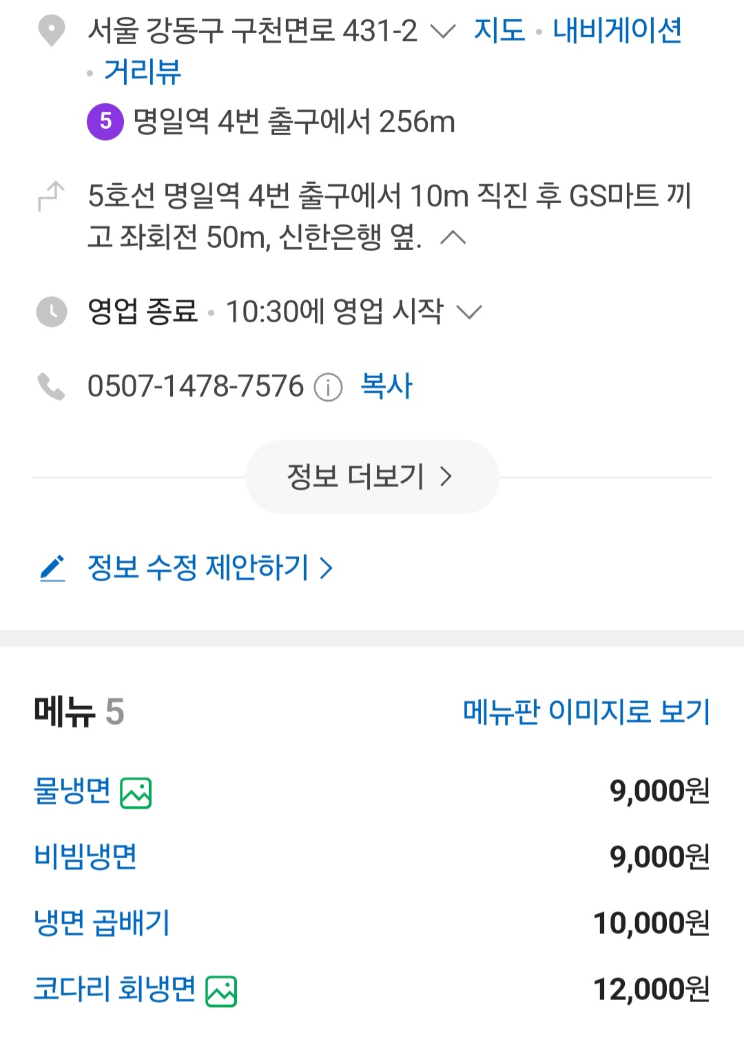 오늘 남편과 함께 명일동에 가끔 가는 삼대냉면집을 다녀왔다. 갑자기 급으로 냉면이 땡겨서 먹게 되었다. 남편은 물냉면을, 나는 비빔냉면을 먹었다. 오랜만에 먹어서 인지 너무 맛있었다. 우선 가격도 저렴하다. 요즘 고물시대에 냉면 한 그릇이 9000원이다. 양도 적당하고, 가게 내부도 깔끔하다. 점점 날씨가 더워지면 냉면 먹으러 자주 가야겠다.